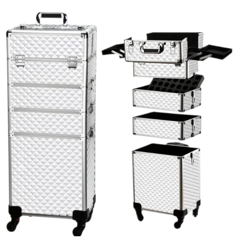 Su diseño moderno, con acabado diamantado en color plateado y bordes metálicos reforzados, lo convierte en una pieza tanto estética como duradera. Gracias a sus ruedas giratorias y asa retráctil, se desplaza fácilmente incluso con el peso de productos, brochas o equipos eléctricos pequeños.