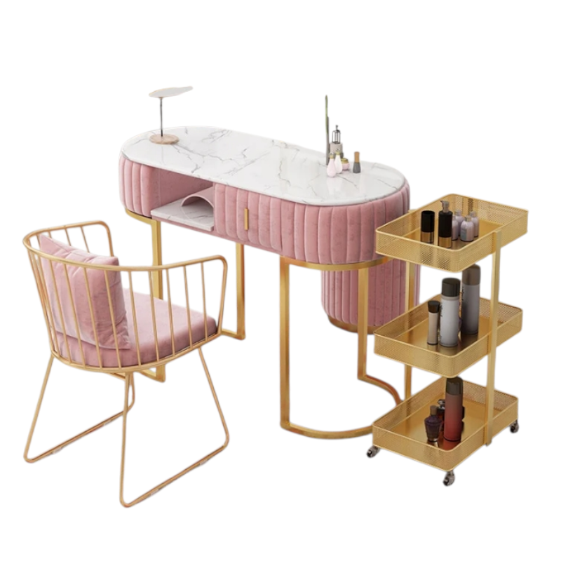 Este set completo para manicuristas incluye un escritorio de 80x45x78 cm, una silla decorativa rosa con base dorada y un sofá tos con respaldo metálico dorado, ideal para salones de belleza, estudios de uñas y spas en Costa Rica que buscan funcionalidad, estilo y comodidad en una sola estación.