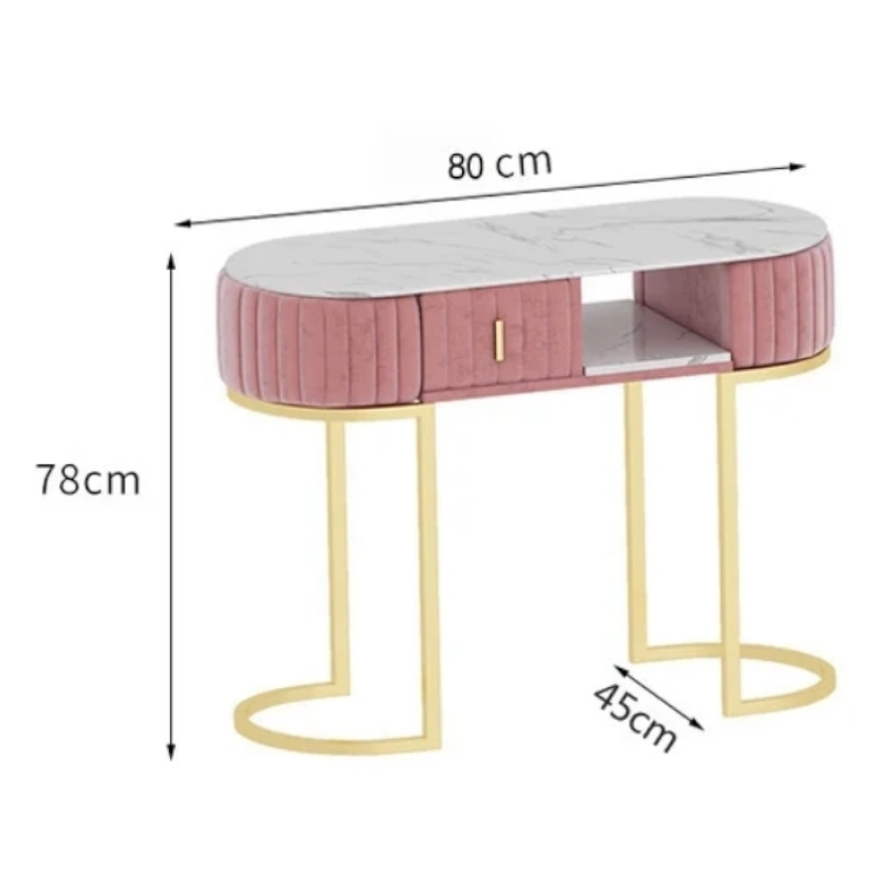 El escritorio cuenta con superficie tipo mármol blanco, estructura tapizada en rosa con costuras verticales, cajón central y repisa abierta, perfecto para organizar herramientas, esmaltes y accesorios. Las patas doradas curvas aportan estabilidad y elegancia.