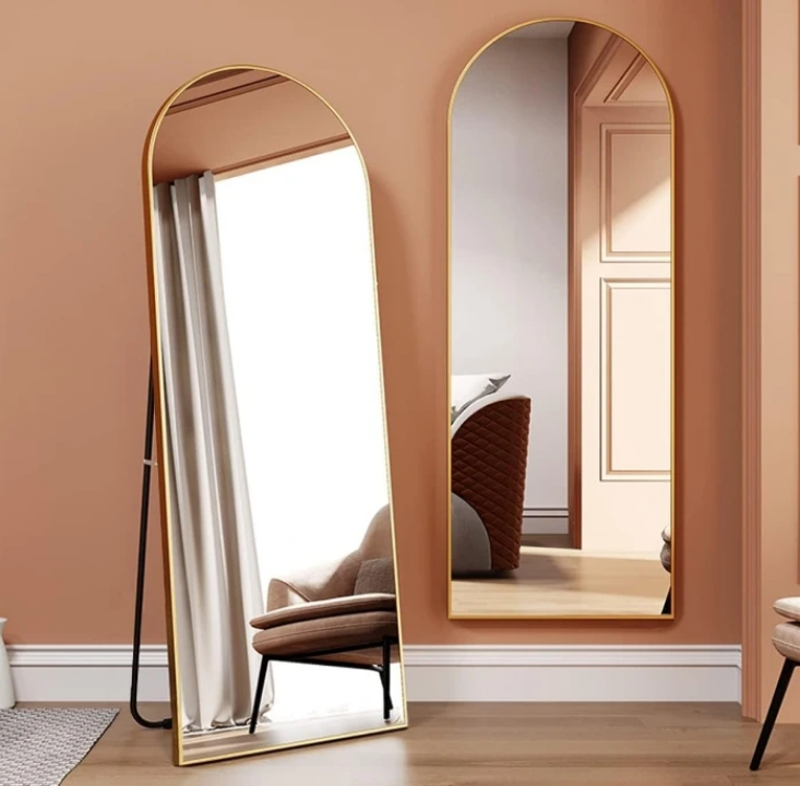 Los marcos metálicos en color dorado combinan con estilos clásicos, minimalistas o contemporáneos. El espejo de pie es perfecto para áreas de cambio o maquillaje, mientras que el de pared optimiza el espacio sin perder impacto decorativo. Ambos ofrecen reflejo nítido, estructura resistente y fácil instalación.